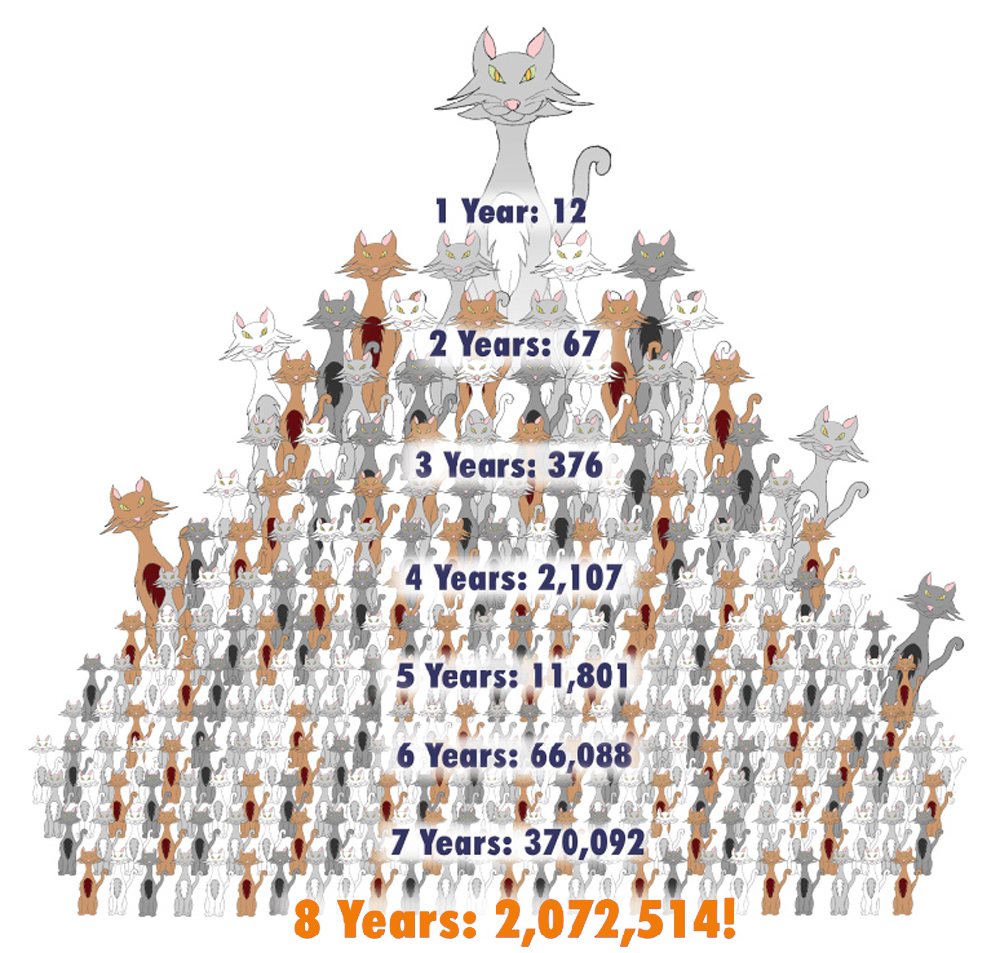 Jameson Humane’s spay and neuter program plays a critical role in reducing animal overpopulation and improving the health and welfare of cats in our community. Our efforts support animals within Jameson Humane’s own programs while also providing vital access for our rescue partners to sterilize both feral and community cats. Just look at the compounded reduction estimates: